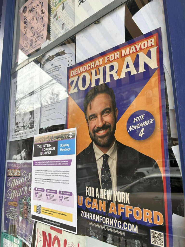 米国の選挙では、ボランティアが電話作戦、党の登録者への個別訪問、一軒一軒を訪問するドアノッキングの3点セットを展開する。しかし、ニューヨーク市は市民の大多数が政治的にリベラルで、民主党が難なく勝利できる地盤。市長選だけでなく、4年に1度の政治的お祭りである大統領選でもボランティアの姿を見たことはなかった。ところが今回は、ゾーランTシャツを着た人々が地下鉄内でマムダニ氏への投票を呼びかけていた。ドアノッキングで不在だった家のドアノブに掛けたカラフルなチラシがあちこちで風に舞っていた。こんなに多くのボランティアが動いている選挙をニューヨーク市で見たことはかつてない。マムダニ氏は勝利集会で、10万人ものボランティアが関わったと明らかにした。