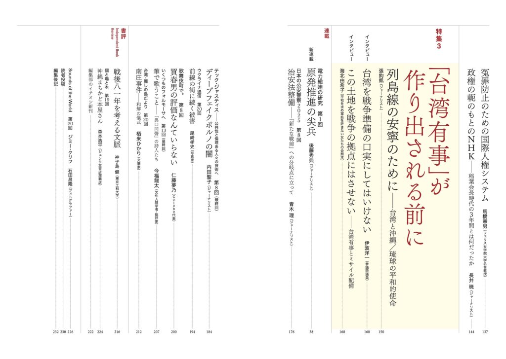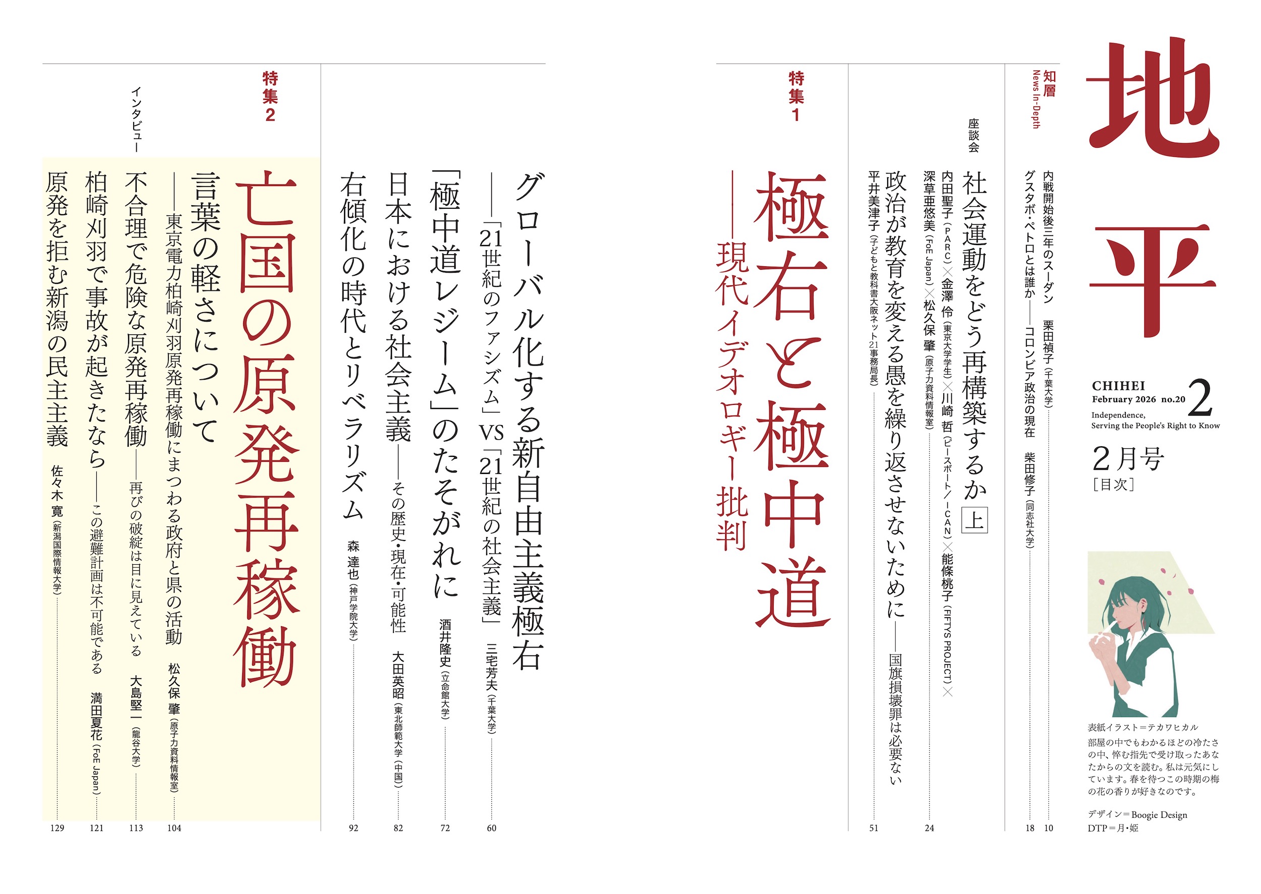 二〇二六年という年がどうなるかを推測することは難しいにしても、どのような年にしてはいけないかは、はっきりしている。日本が戦後八一年目にして再び戦争を始める年にしてはならないし、再び原発事故を起こす年にしてはならない。今号はこの二点に関わる特集を組んだ。
