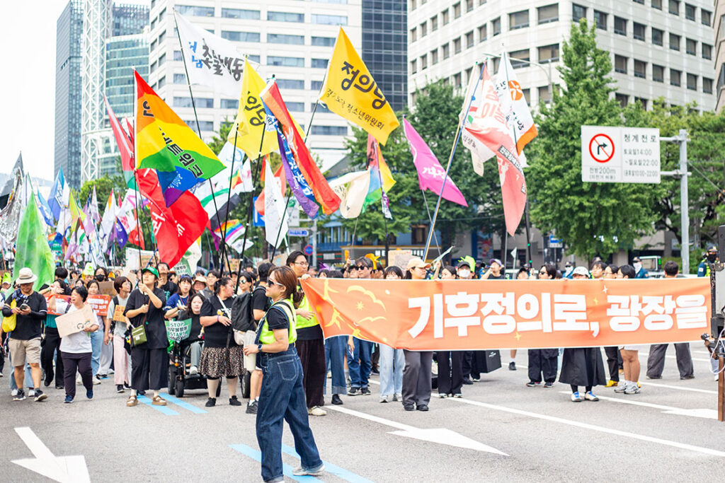 気候正義行進は韓国で年一回行なわれる集会とデモ行進で、二〇二五年はソウルに三万人が集まった。事前に五〇〇以上の市民団体、社会運動グループ、労働組合、協同組合、政党が賛同を示し、当日には六〇〇以上の団体が参加した。二〇一九年に五〇〇〇人規模で行なわれた気候変動問題を中心としたアクションに始まり、二〇二二年には「気候正義」を軸としたデモの企画で二万人が集まる規模になった。